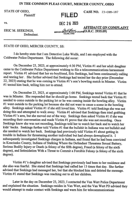 (12-28-23) Eric Seekings (41) Van Wert was arrested by the Coldwater Police Department after he allegedly harassed his ex-girlfriend who lived in Coldwater by calling and texting her numerous times.
