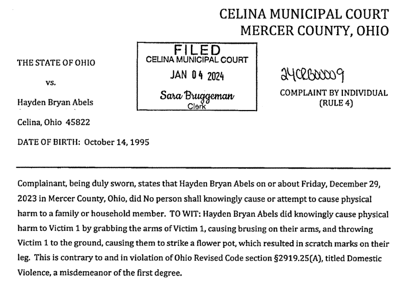 According to Celina Municipal Court records Abels was arrested and found guilty of domestic violence in November of 2022. He was scheduled to apperar in court today due to not following sentencing conditions on that charge. – 29 DAYS JAIL SUSPENDED ( DAYS ARE NOTICE DAYS FOR PROBATION) ON THE CONDITIONS THERE ARE NO VIOLATIONS OF THE FOLLOWING COMMUNITY CONTROL SANCTIONS FOR 2 YEARS