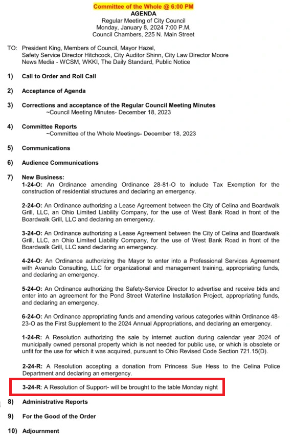 (1-6-24) Monday night three new Celina City Council members will be attending their first meeting since being voted in this past November. All three are Republicans…Joe Wolfe, Matt Gray and Tom Sanford. They replace two council members who were voted out in November, Eric Lochtefeld a Democrat and Mike Sovinski, who had been a Republican but ran as an Independent. Calvin (June) Sott, a Democrat, decided not to run for re-election.