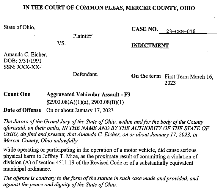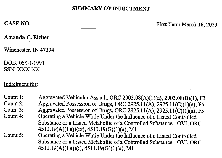 (1-10-24) Amanda Eicher (32) of Winchester, Indiana was sentenced today on a 3rd degree felony Aggravated Vehicular Assault charge that stemmed from a January 17th (2023) incident.
