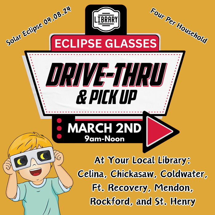 (1-25-24) Mercer County’s seven public libraries are gearing up for a drive-thru pickup event on Saturday, March 2nd, from 9 am to Noon, outside each library. This event marks the beginning of the distribution of 40,000 Free Solar Eclipse Glasses, a collaborative effort by the Mercer County District Library, Celina-Mercer County Chamber, Mercer County Fairgrounds, and the support of local organizations.