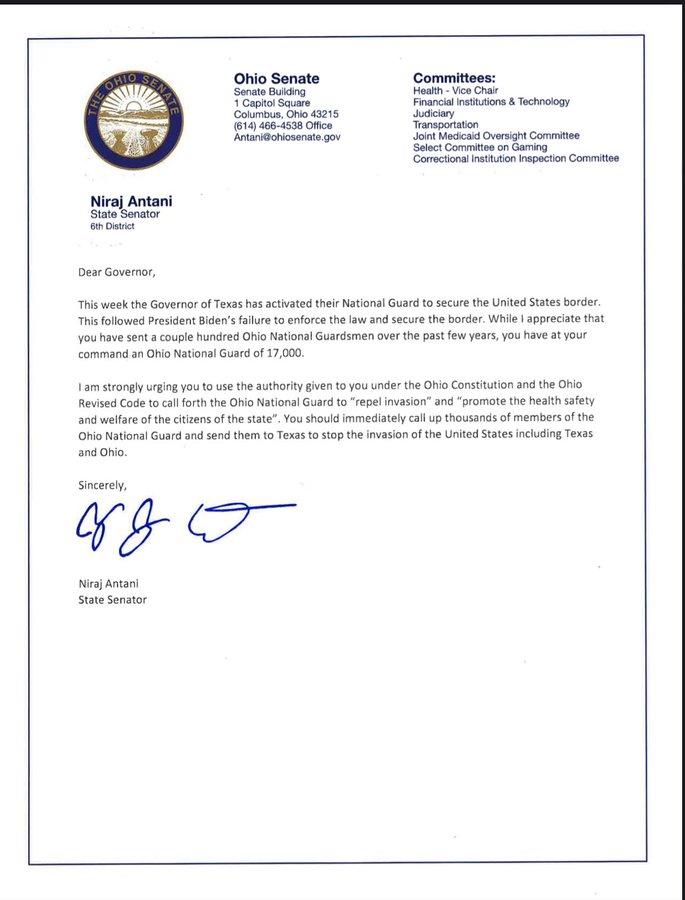 (1-27-24) Republican Ohio State Senator Niraj Antani (District 6) sent a letter to Governor Mike DeWine to encourage him to send National Guard troops to the Texas border to help with the current crisis.