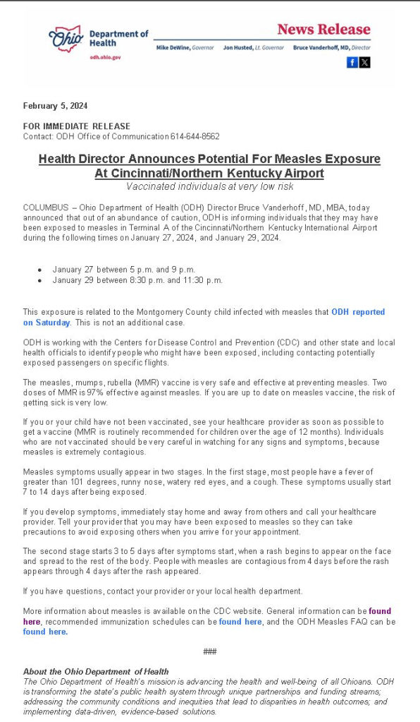 (2-7-24) The Ohio Department of Health announced that there was a measles exposure the at Cincinnati /Northern Kentucky Airport.