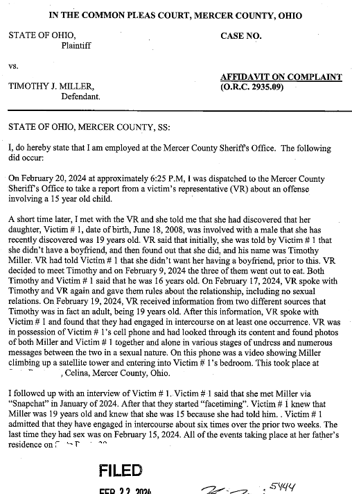 (2-22-24) Timothy J Miller (19) of Mendon was arrested by the Mercer County Sheriff’s Office yesterday on six 4th Degree Felony counts of Unlawful Sexual Conduct with a minor. The complaint (see below) is from alleged incidents that took place at various times this month with a 15 year old female. The complaint also states Miller was at least 4 years older than the person he engaged with in sexual conduct. Miller is being held in the Mercer County Adult Detention Center with $150,000 (10%) bond pending an initial appearance in Mercer County Common Pleas Court tomorrow (2-23-24) at 1pm.
