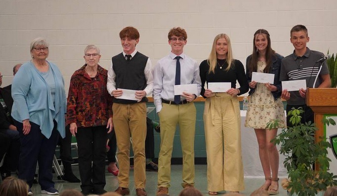 Pictured above –– The 2023 winners and two members of the scholarship committee, Linda May and Mary Lehman.