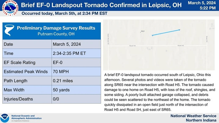 (3-5-24) The National Weather Service (NWS) has confirmed that today a landspout tornado was confirmed in Leipsic in Putnam County at around 2:35pm.