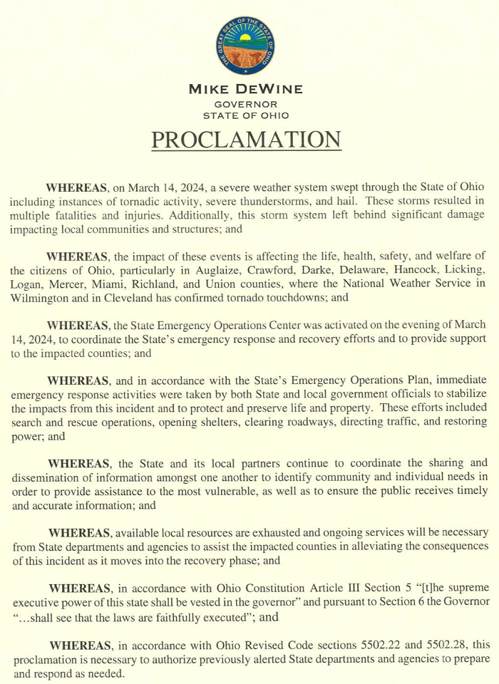 (COLUMBUS, Ohio) 3-17-24 –— Ohio Governor Mike DeWine issued a proclamation today declaring a state of emergency across 11 counties impacted by last week’s severe weather.