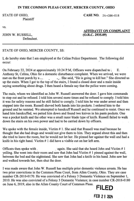 (4-6-24) John Russell (49) Celina will appear in a pre-trial hearing in Mercer County Common Pleas Court on multiple charges on his birthday April 10th at 9 am.