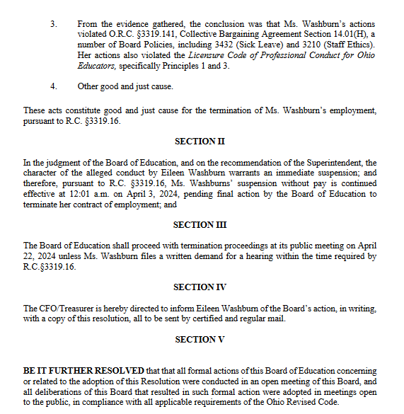 Interim Superintendent Elizabeth Lolli has recommended that the board continue Washburn’s current suspension without pay and then vote to terminate her at their next regularly scheduled meeting on April 22 unless “Washburn files a written demand for a hearing within the time required,” the resolution shows.