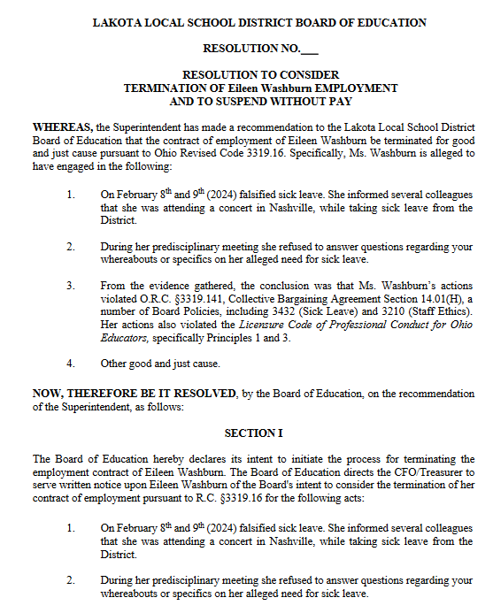 (4-7-24) A Lakota English teacher, Eileen Washburn, faces termination and is on unpaid leave after calling in sick for two days (February 8th and 9th) to attend a concert in Nashville.