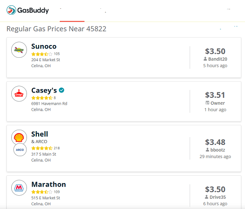 Neighboring areas and their current gas prices: