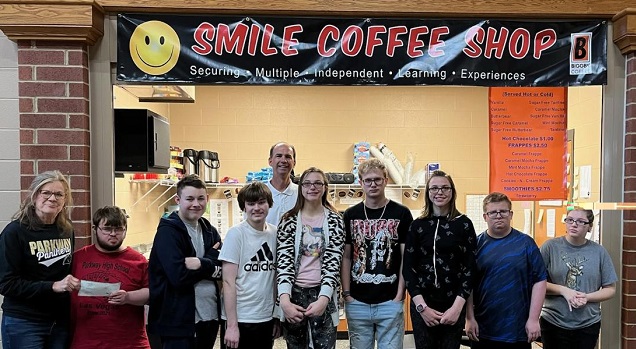 Rockford Council member Mary Beougher presents Doug Hughes and the Parkway SMILE students a donation for helping out with cleaning services at the Rockford Community building at Shanes Park. This is part of a partnership with Parkway Schools.