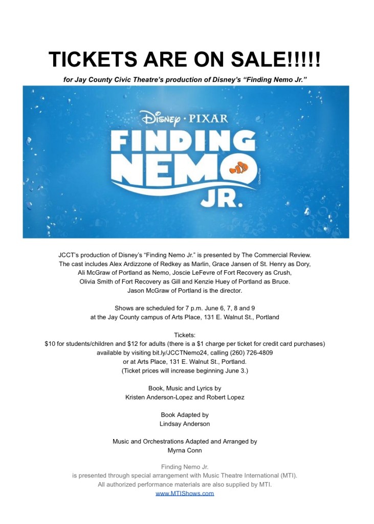 Tickets are $10 for students/children and $12 for adults (there is a $1 charge per ticket for credit card purchases) and are available by visiting bit.ly/JCCTNemo24, calling (260) 726-4809 or at Arts Place, 131 E. Walnut St., Portland.