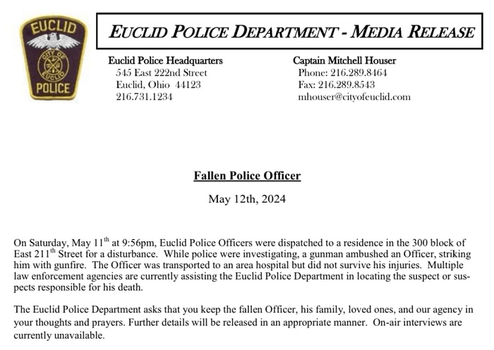 (5-12-24) With today starting National Police Week, Ohio is mourning an Euclid Police Department Officer.
