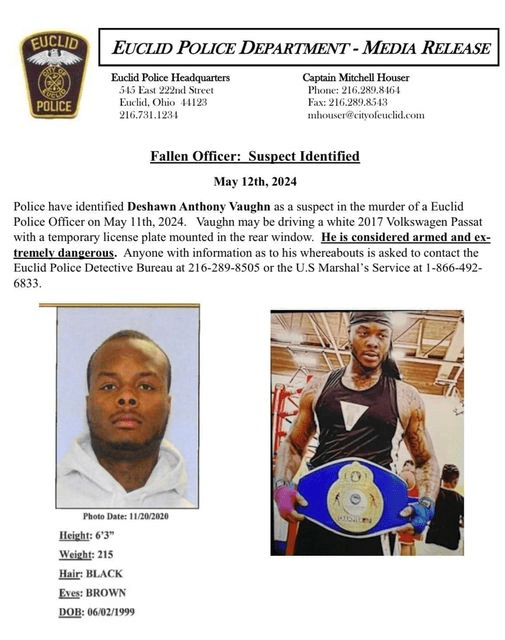 Euclid Police have identified the suspect as Deshawn Anthony Vaughn (24). He is described as 6’ 3” tall, weighing 215 pounds with black hair and brown eyes. He may be driving a white 2017 Volkswagen Passat with a temporary license plate mounted in the window. He should be considered armed and dangerous.