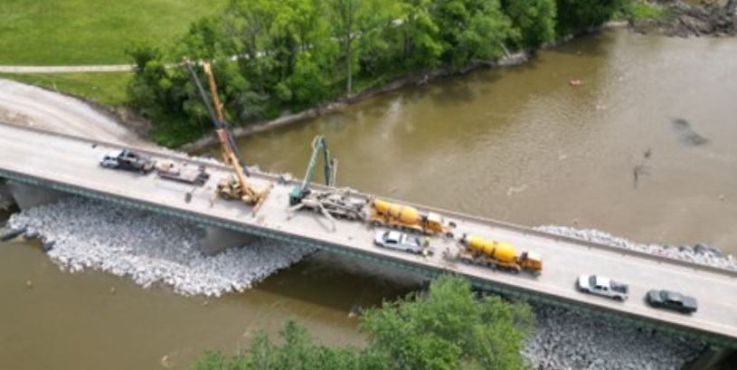 The bridge was closed May 8, 2023 and was completely reconstructed during that time. Work to complete the bridge will continue once it is reopened to traffic. Remaining work includes sealing of concrete, seeding, and tree planting.