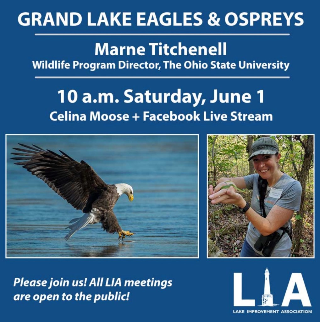 (GRAND LAKE) – The public is invited and encouraged to learn about Grand Lake’s bald eagles and ospreys with Marne Titchenell at the June 2024 Lake Improvement Association meeting, to be held at 10 a.m. Saturday, June 1, at the Celina Moose.
