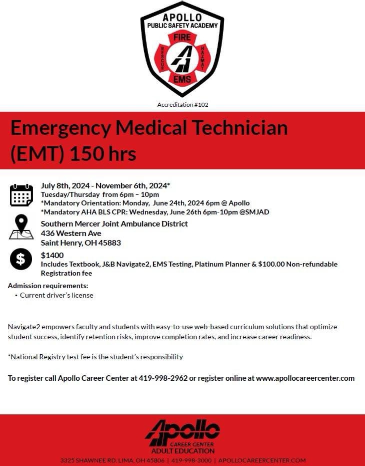 (6-5-24) Southern Mercer County Joint Ambulance District…EMT classes will be hosted at the St. Henry Squad house starting June 24th and will run until November 6th. Classes will be every Monday and Wednesday evening from 6p-10pm. Class cost will be covered by Organization.