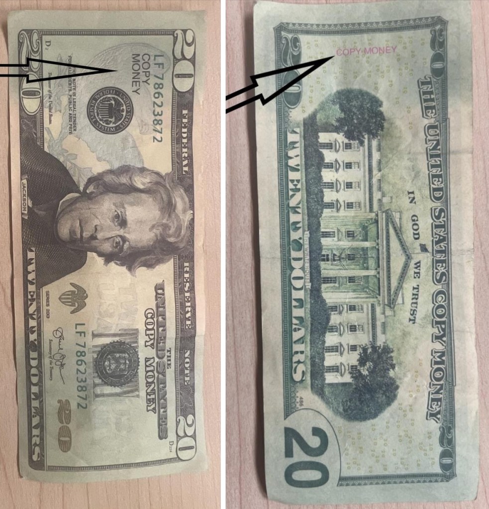 But while the writing is clear as day in photos authorities warn that this isn’t always the case, and some counterfeit bills might not have this giveaway printed on them.