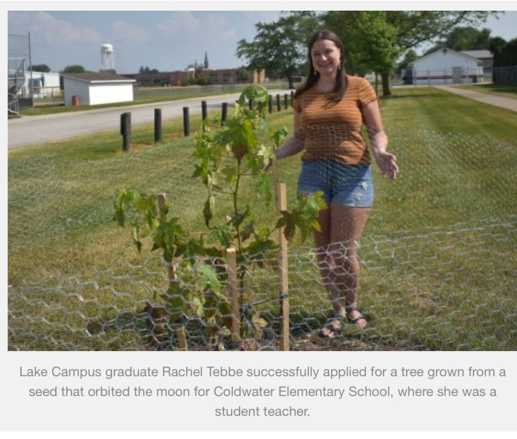 Then things happened quickly. Tebbe got word from NASA and the U.S. Forest Service that a Moon Tree would be delivered to the Coldwater school. The sweet gum arrived a week and a half later, and it was planted with the help of a local landscaping company.