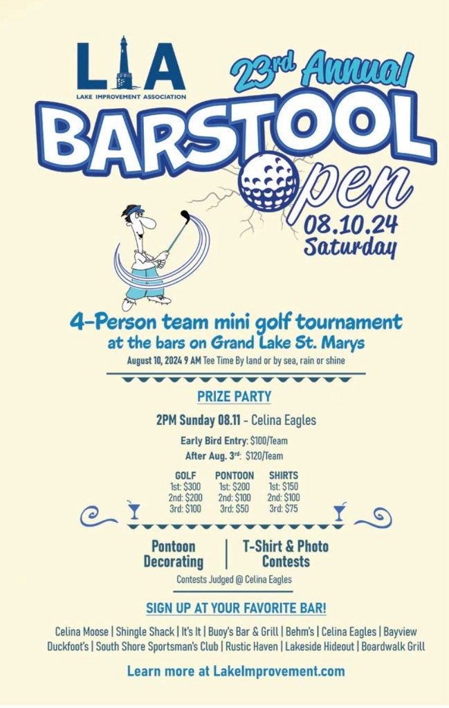 (GRAND LAKE ST. MARYS) – The Lake Improvement Association will host its 23rd annual BarStoolOpen at the bars on Grand Lake St. Marys on Saturday, Aug. 10, 2024.
