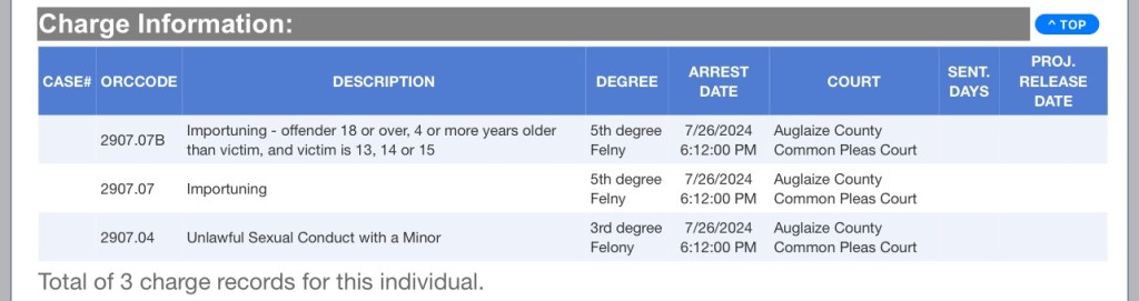 (7-29-24) Scott Alan Austin (58) of Wapakoneta is being held in the Auglaize County Jail without bond on felony charges of 3rd degree unlawful sexual conduct with a minor and two counts of 5th degree importuning.