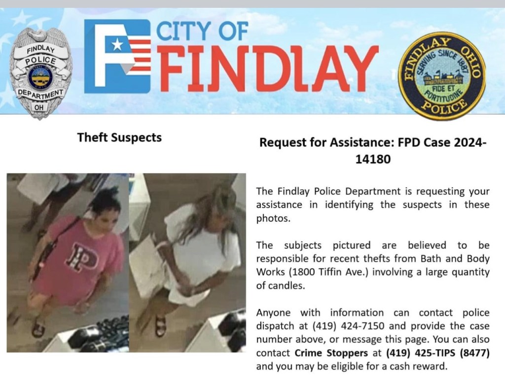 (8-2-24) Findlay Police are looking for help in identifying suspects in recent thefts at the Bath and Body Works involving a large quantity of candles