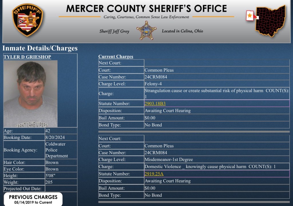 (8-20-24) The Coldwater Police Department arrested Tyler Grieshop (42) today on a 4th degree felony charge of strangulation (cause or create substantial risk of physical harm). How also being charged with a 1st degree misdemeanor of domestic violence (knowingly causing physical harm).