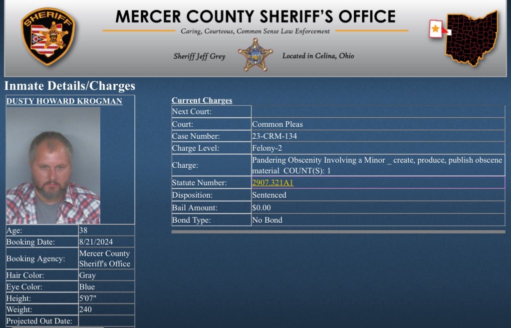 (8-21-24) Dusty Krogman (38) of Mendon was sentenced today on pandering obscenity involving a minor, 2nd degree felony.