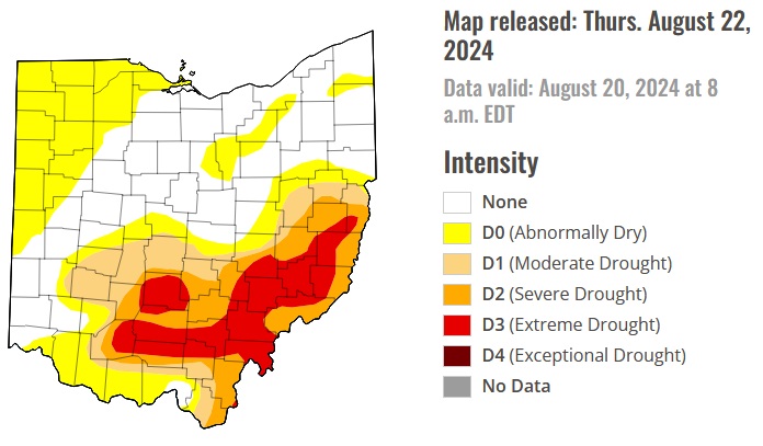 (8-22-24) The National Weather Service in Wilmington released the latest drought conditions around Ohio…Southeastern Ohio was the drought epicenter for the region, where abnormal dryness and moderate to extreme drought expanded. Abnormal dryness expanded in northern Indiana and northeast Illinois. But abnormal dryness and drought contracted in other areas, including Kentucky, Missouri, and Wisconsin. Drought impacts, that were reported in Ohio, include no growth on pastures, creeks and private wells running dry, low ponds, farmers and ranchers hauling water and feeding hay, some soybean and corn fields completely gone, trees losing leaves, and low intensity woodland wildfire activity. According to USDA data, 57% of the topsoil and 65% of the subsoil in Ohio is short or very short of moisture.
