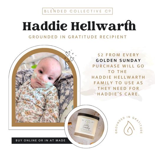 Haddie is the Blended Collective Co. Fall of 2024 Gratitude Recipient…this is how you can support Haddie and her family by purchasing a Golden Sunday candle from Blended Collective when they launch . Two dollars from each candle sale goes to Haddie and her family.