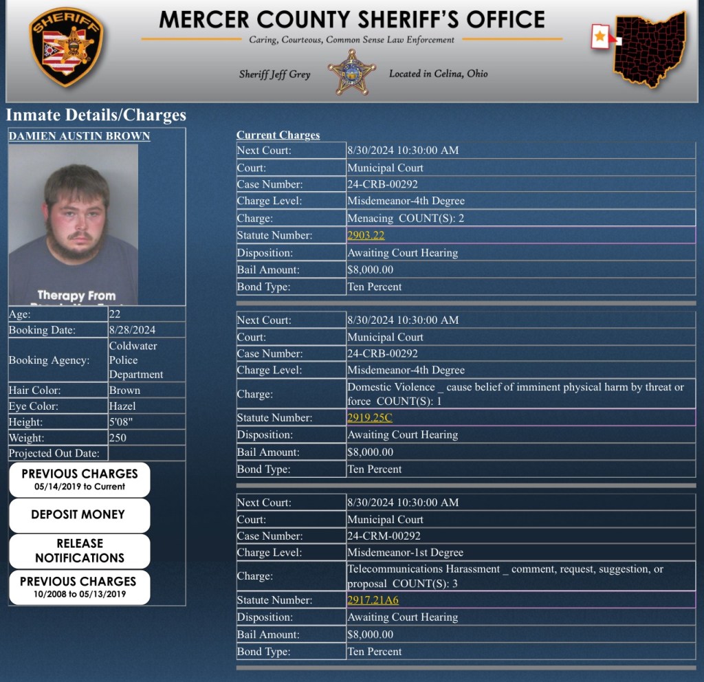 (8-28-24) Damien Brown (22) of Celina was arrested today by the Coldwater Police.