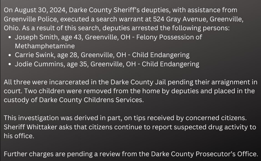 Arrests, local news, Regional Three Arrested In Darke County For Child Endangering And Drug Charge Date: August 30, 2024Author: statelinesportsnetwork 0 Comments (8-30-24) Today three Greenville residents were arrested by the Darke County Sheriff’s Office. Share this: Click to share on X (Opens in new window) X Click to share on Facebook (Opens in new window) Facebook Like Loading... Related