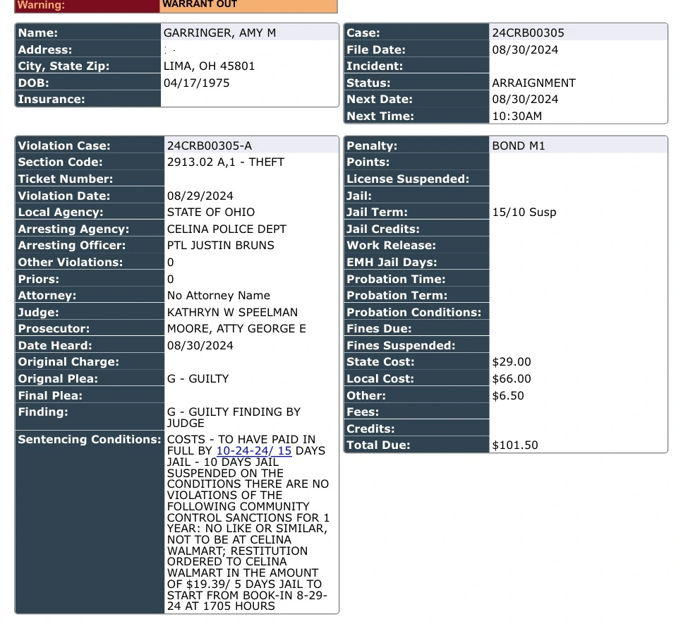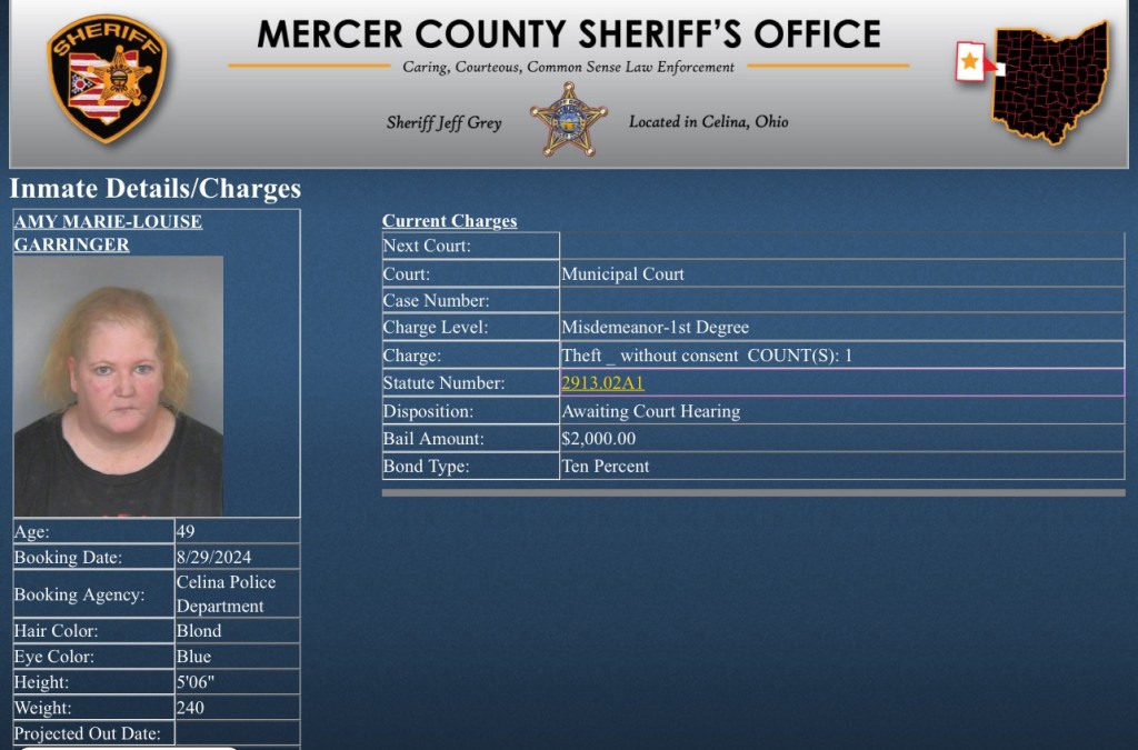 This morning Amy Garringer (49) was found guilty in Crlina Municipal Court of a theft incident at the Celina Walmart. She was arrested on the charge yesterday and was housed at the Mercer County Adult Detention Center.