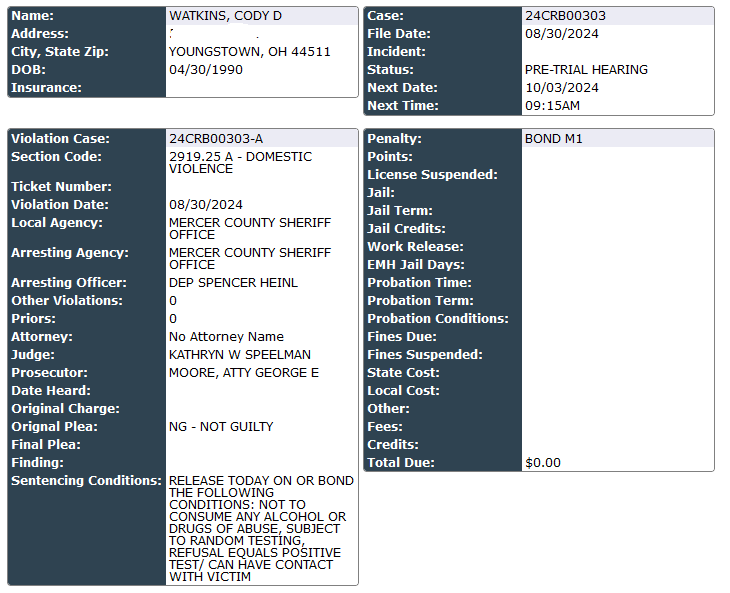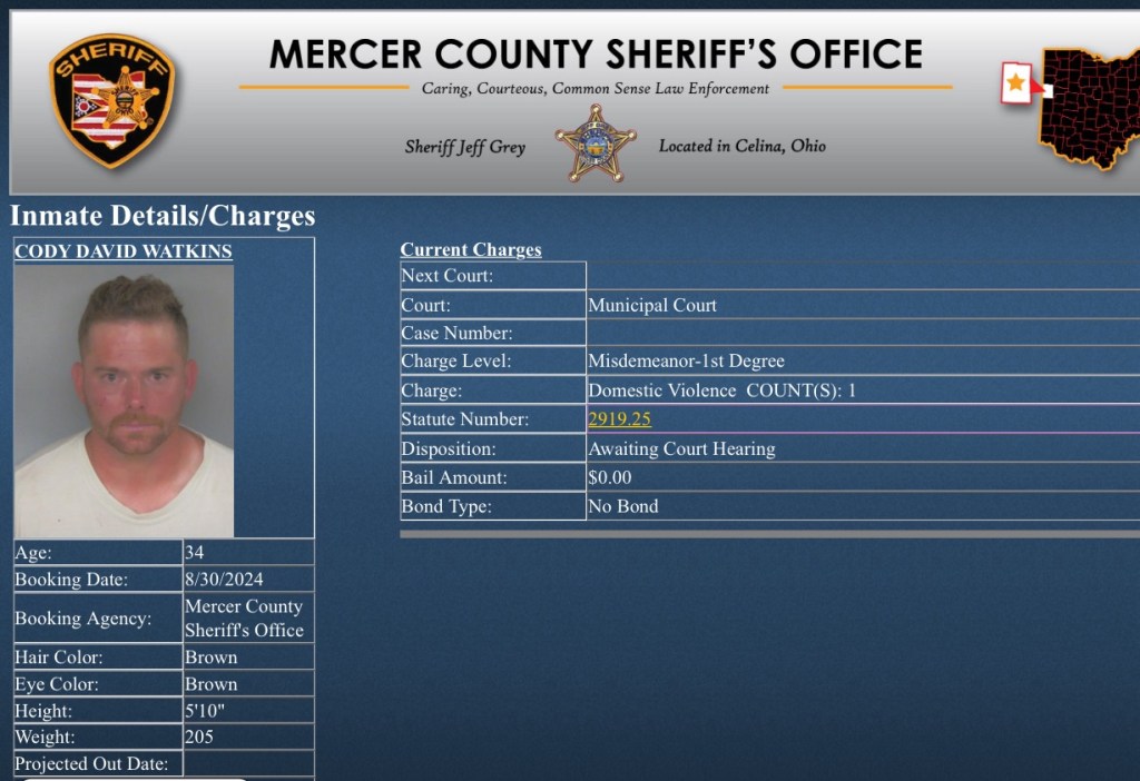 Cody Watkins (34) of Youngstown was arrested today on a 1st degree misdemeanor domestic violence charge. He pleaded not guilty to the charge today in Celina Municipal Court.