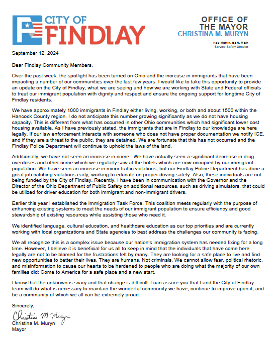 (9-12-24) Findlay Mayor Christiana Muryn released a letter today about the current immigrant situation in her city. The issue went nationwide after this week’s Presidential Debate focusing on the situation in Ohio.