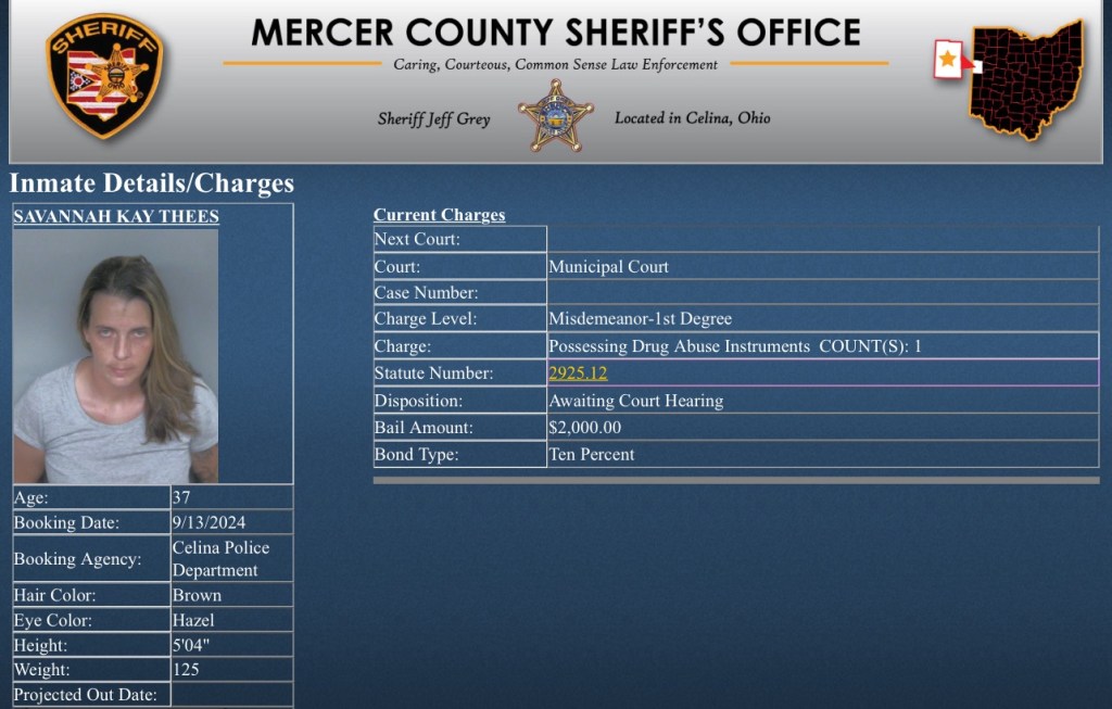 (9-14-24) Savannah Thees (37) of Celina was arrested yesterday by the Celina Police Department on a 1st degree misdemeanor of possessing drug abuse instruments.
