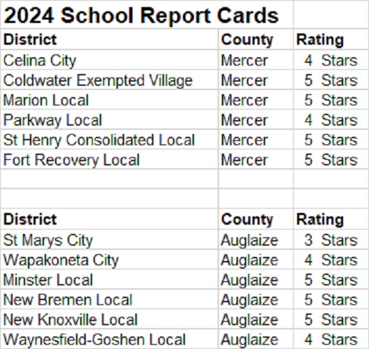 Overall four Mercer County Districts, Coldwater, Marion Local, St. Henry and Ft. Recovery received the highest ranking awarded with a 5-Star, while Celina and Parkway received the 4-Star ranking.