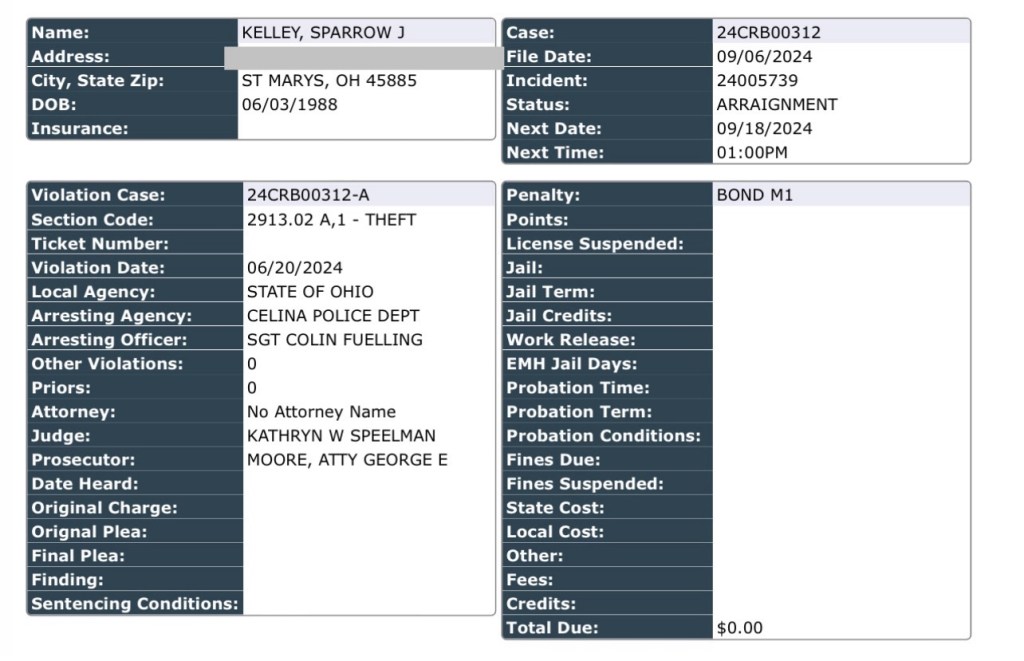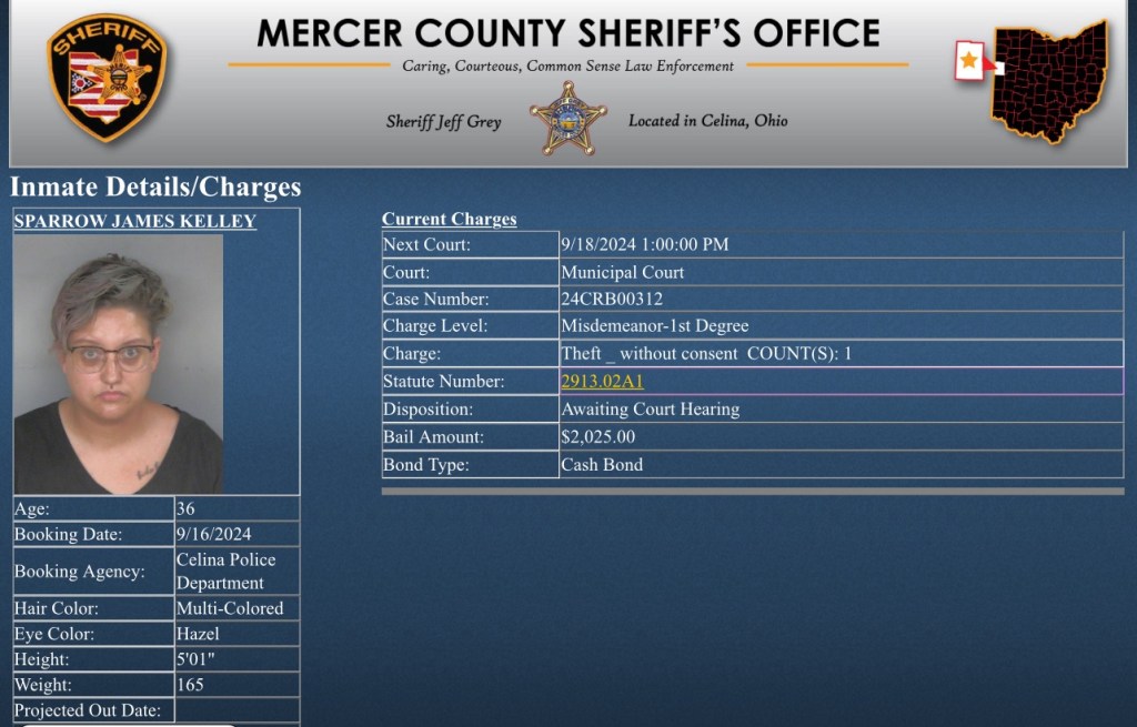 Sparrow James Kelley (36) of St. Marys is being held on a 1st degree misdemeanor of theft without consent, the violation took place on June 20. Kelley’s next Celina Municipal Court date is scheduled for September 18th and has a cash bond of $2,025