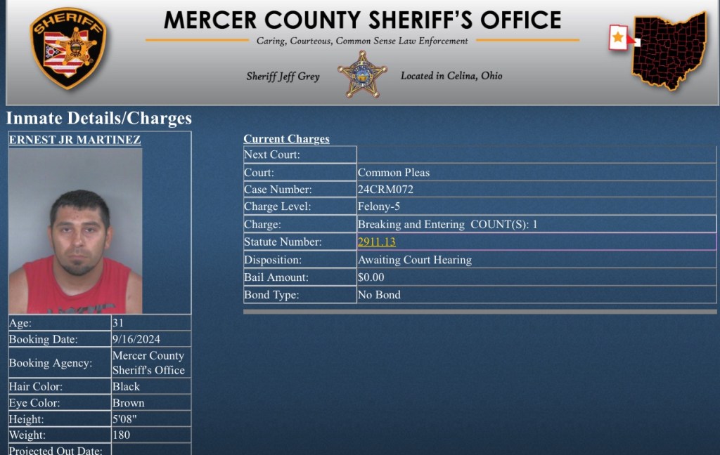 Ernest Jr Martinez (31) was booked today on a 5th degree breaking and entering charge and is being held with no bond. He is awaiting on a hearing in the Mercer County Common Pleas Court.
