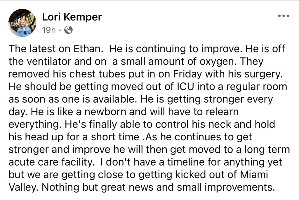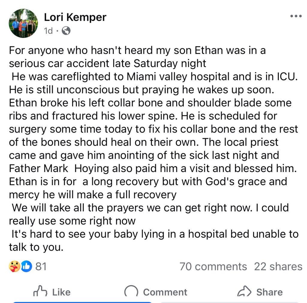 (9-17-24) Ethan Kemper of St. Henry is presently in the ICU at Miami Valley Hospital after a serious car crash on Saturday night.