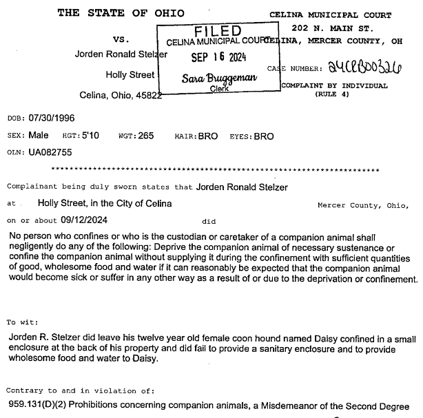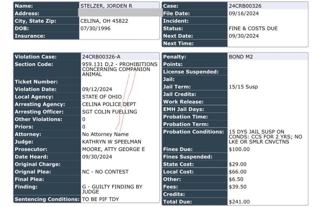 UPDATED: (9-30-24) Jorden Stelzer, after a plea of no contest, was found guilty today by the judge on charge of prohibitions concerning companion animal.