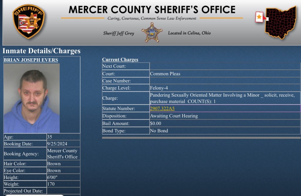 Brian Evers (35) was arrested by the Mercer County Sheriff’s Office on a 4th degree felony charge of pandering sexually oriented matter involving a minor.