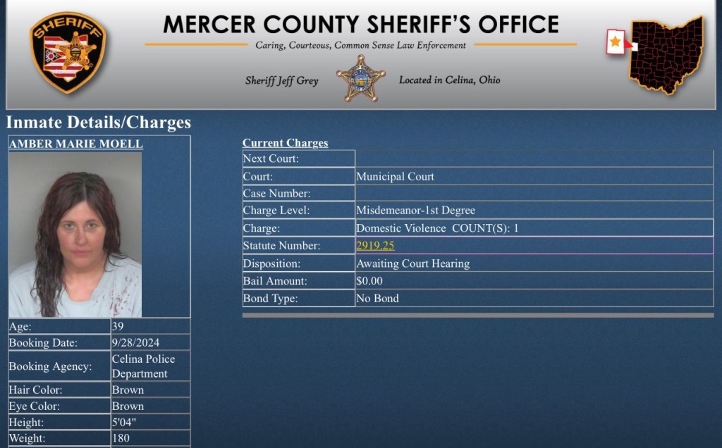 (9-28-24) Amber Moell (39) of St. Marys was arrested today for a 1st degree misdemeanor Domestic Violence chargeby the Celina Police Department.