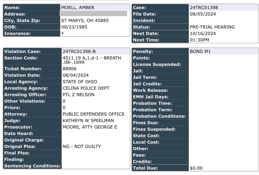 She also has an October 16th hearing on an OVI charge from August 5th.