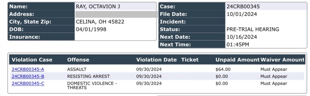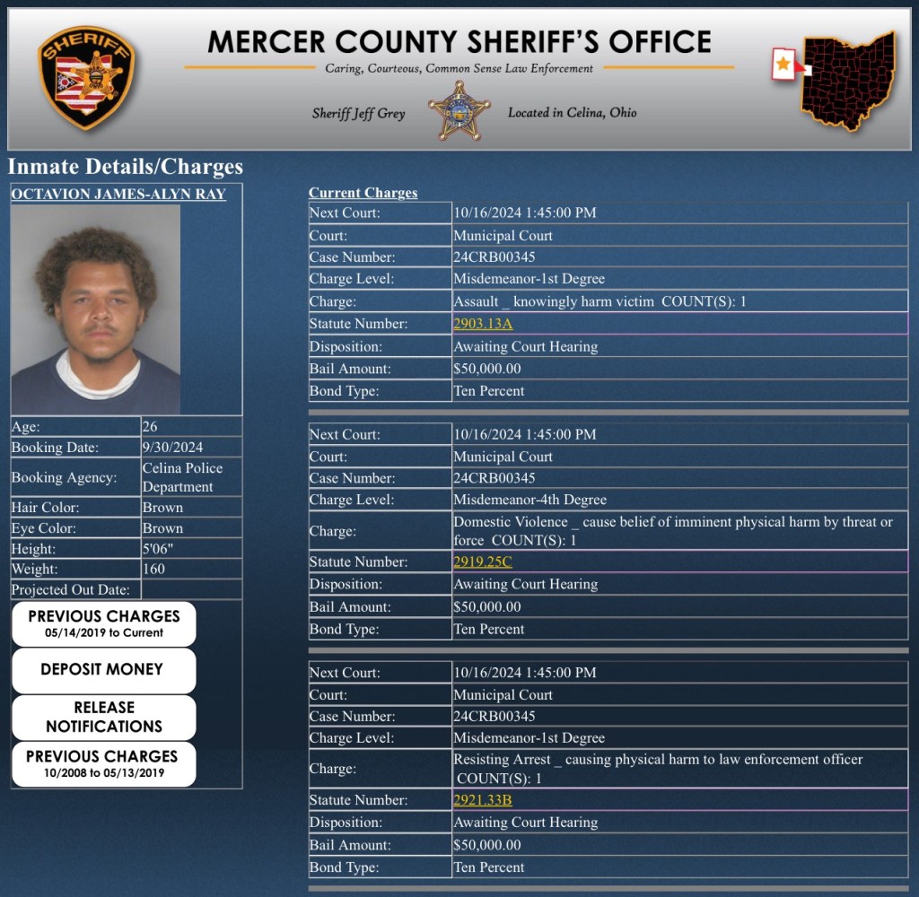 (10-8-24) Octavian James-Alyn Ray (26) of Celina was booked into the Mercer County Adult Detention Center’s Celina Police recently.