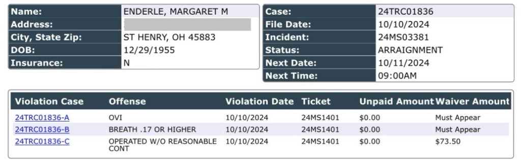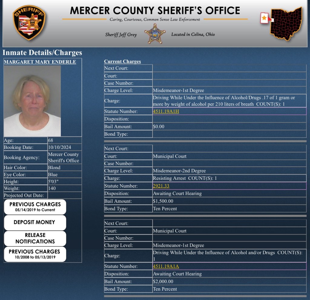 (10-10-24) Margaret Enderle (68) of St. Henry was arrested today by the Mercer County Sheriff’s Office.