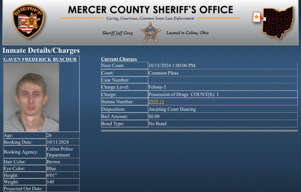 (10-11-24) Gaven Buschur (26) of Celina was arrested today on a 5th degree felony charge of possession of drugs.