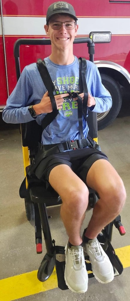 Also modeling the different harness/chair styles to show off the difference is one of our EMT-Basic students Mason Ayers who is currently in the process of completing his EMT-B.