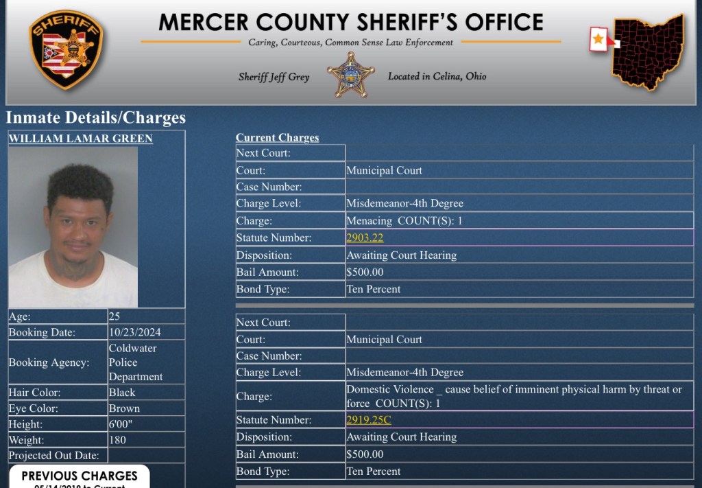 (10-23-24) The Coldwater Police made the arrest today of William Green (25) on two misdemeanor charges of menacing and domestic violence.